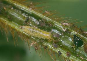 Important predator of aphids. Adults feed on honeydew and are not predatory | Larvae look similar to hoverfly larvae and are distinguished by ‘two horns’ at rear of body. | Crops and weed hosts. Spring to autumn | |