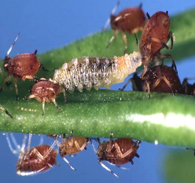 Larvae are aphid predators. | Can be difficult to see, particularly in the early instars. Usually found amongst dense aphid infestations. Larvae leave aphid skins once they have fed, although these are difficult to distinguish from the shed skins of moulting aphids. |