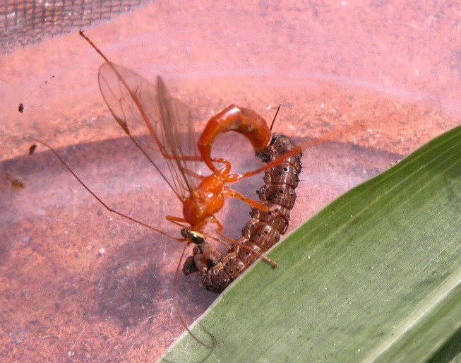 Parasitoid wasps lay eggs into larvae or pupae of caterpillar pests. The caterpillar may be killed prior to, or during pupation. | Medium-large wasps/flies can be seen actively seeking out larvae in crops.