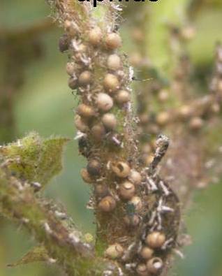 Aphid parasitoids are specific to aphids, or to a particular species of aphids. The wasps will lay eggs in both small and large aphids, depending on availability. | Mummies are characteristic of aphid parasitoid activity. Look for brown, bloated aphid mummies amongst aphid colonies. From ‘sting’ to mummy takes about 10 days. Recording the relative number of mummies and live aphids can provide an indication of the impact the parasitoids are having on the aphid infestation. The small wasps may be visible, in close proximity to aphid colonies. |