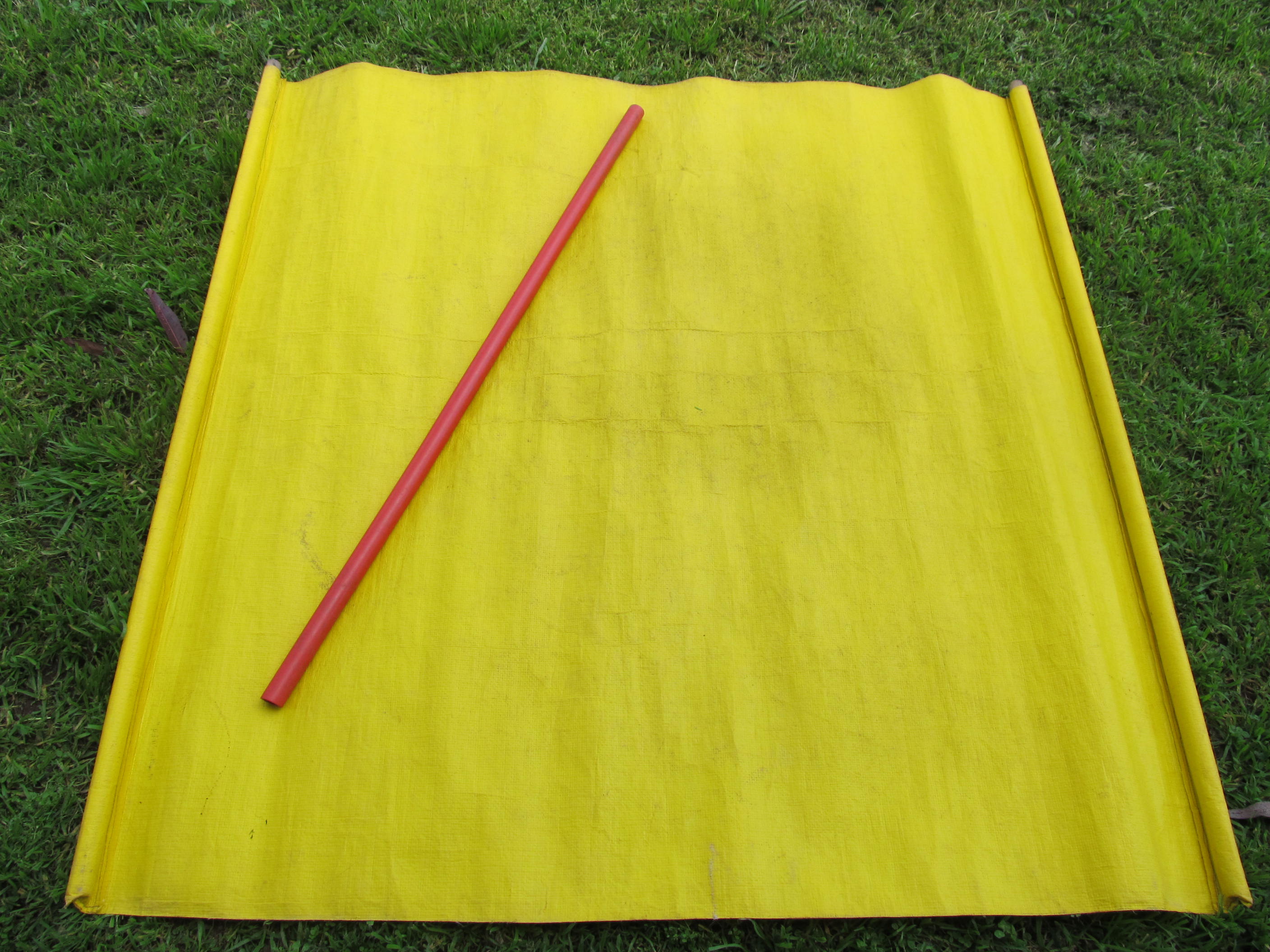 A standard beat sheet is made from yellow or white tarpaulin material with heavy dowel on each end. Beat sheets are generally between 1.3-1.5 m wide by 1.5-2.0 m deep, the larger dimensions being preferred for taller crops. The extra width on each side catches insects thrown out sideways when sampling and the sheet’s depth allows it to be draped over the adjacent plant row. This prevents insects being flung through or escaping through this row.