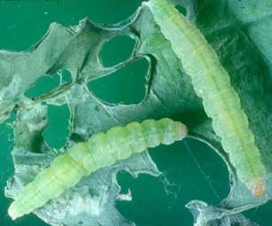 The small green larvae wriggle violently when disturbed. Damage includes clear membranous windows in leaves. From flowering to maturity, larvae can be present in flowering heads feeding on buds and flowers, causing damage to young pods and surface grazing on maturing pods |