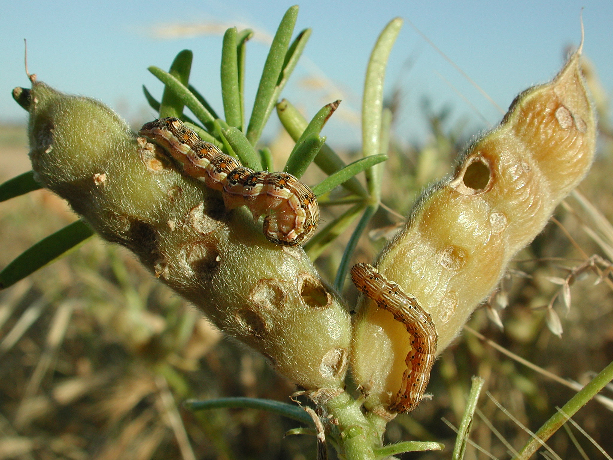 Feeding holes in pods are evident and parts or whole seeds are consumed, resulting in reduced yield and quality